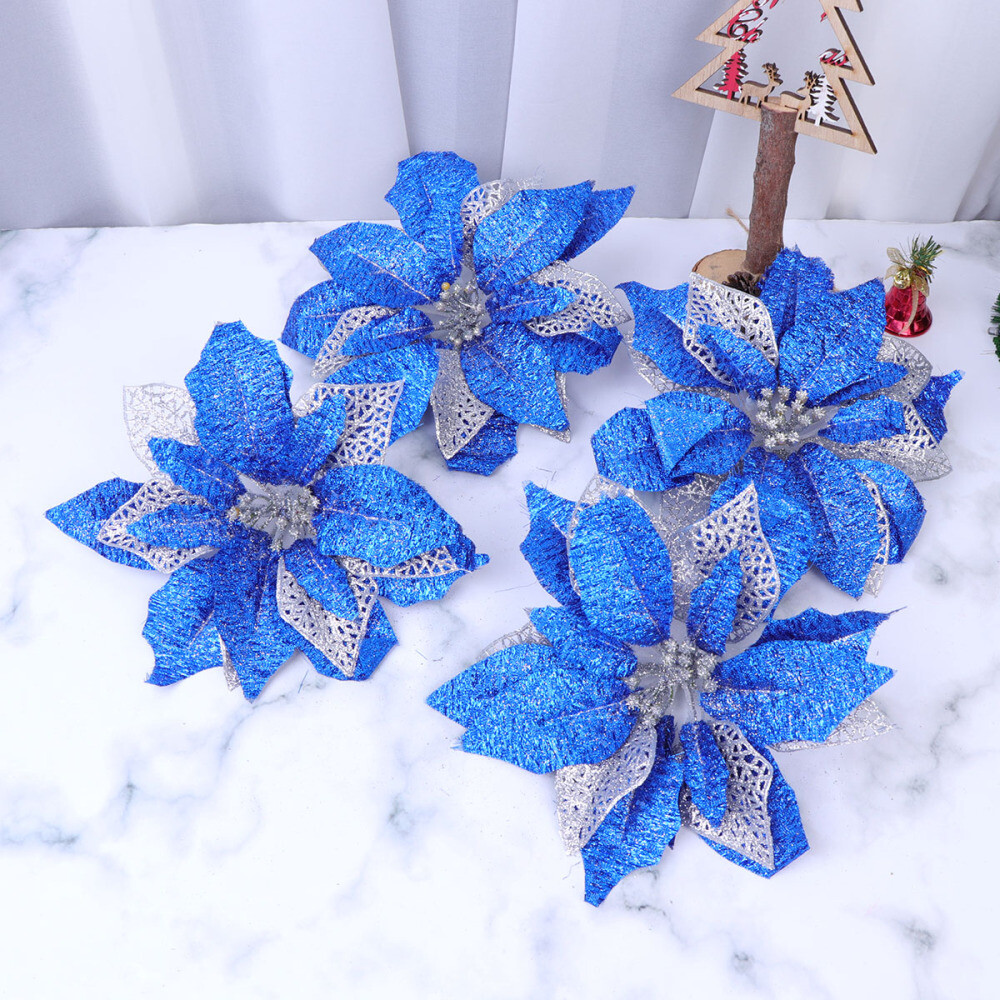 4 Pcs Flowers Decor Blue Poinsettia Christmas Tree Fake Holiday Topper | eBay
