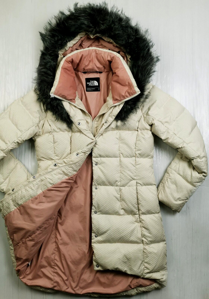 HOT Women THE NORTH FACE 550 QUILTED GOOSE DOWN DOT FUR HOOD LONG CREAM JACKET S | eBay