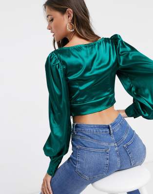 Gathered Waist Satin Top Green | na-kd.com