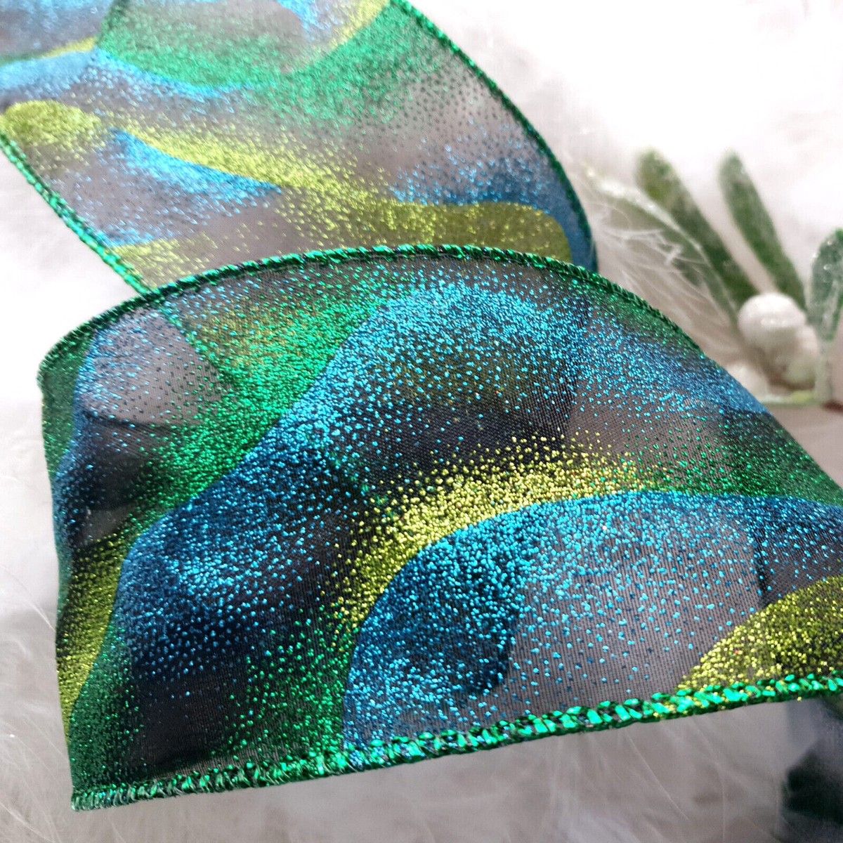 1m x 65mm LUXURY WIRED CHRISTMAS RIBBON SPARKLY PEACOCK BLUE u0026 GREEN TREE BOW | eBay